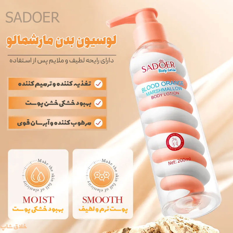 لوسیون بدن مارشمالو مرطوب کننده و آبرسان بدن برند سادور رایحه پرتقال